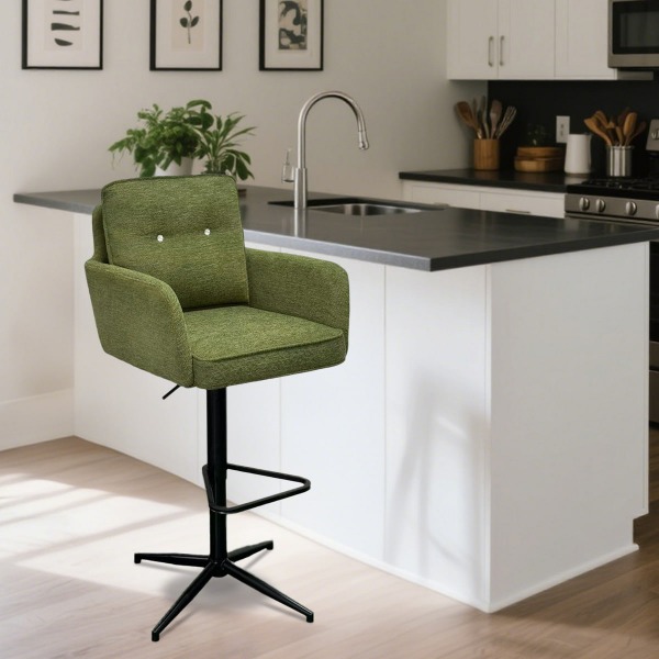 Modern Green Fabric Adjustable Swivel Bar Stool with Auto-Return and Metal Base