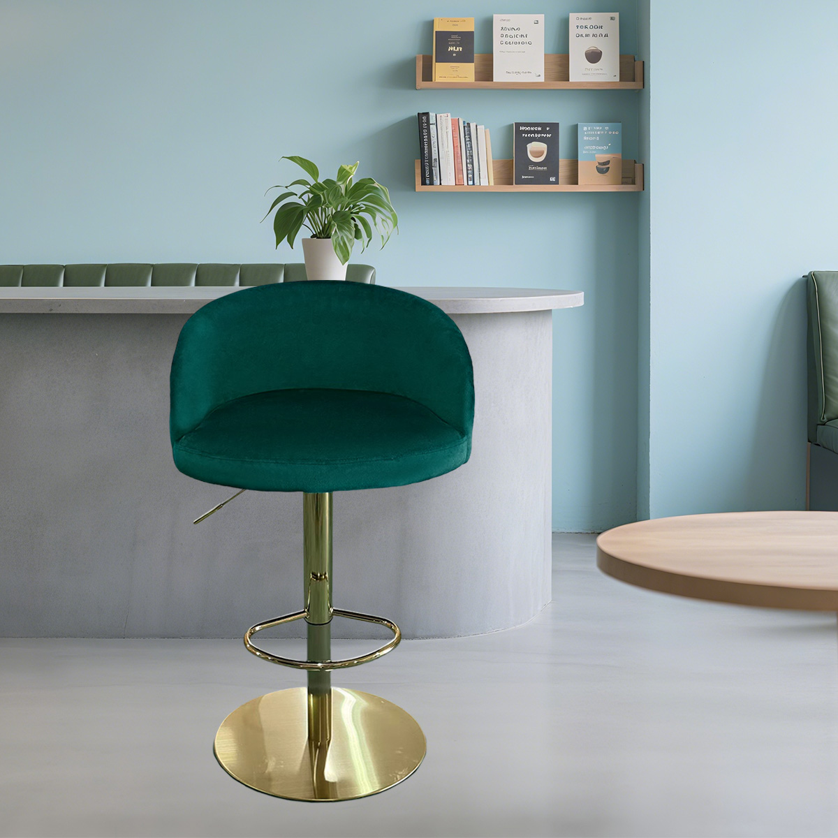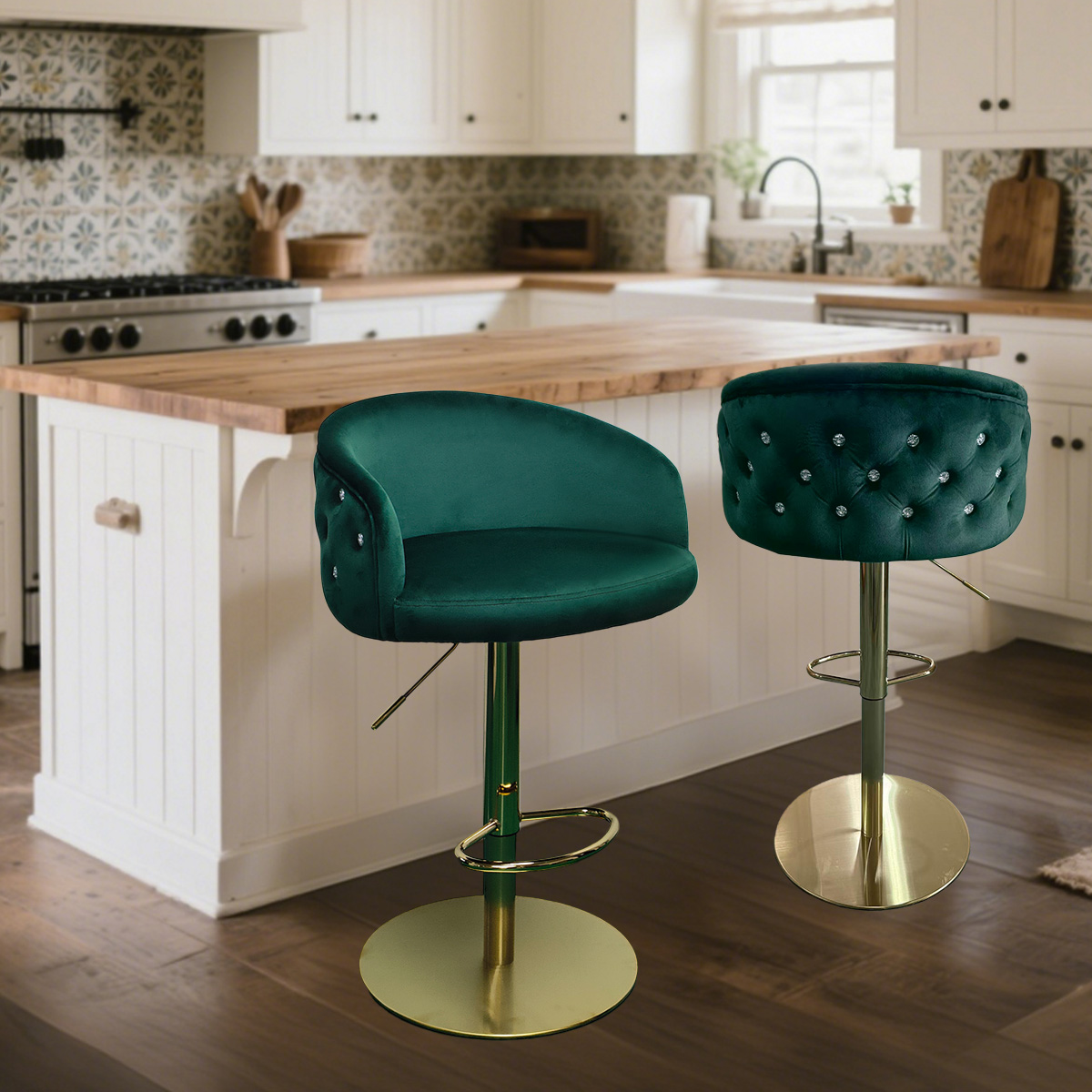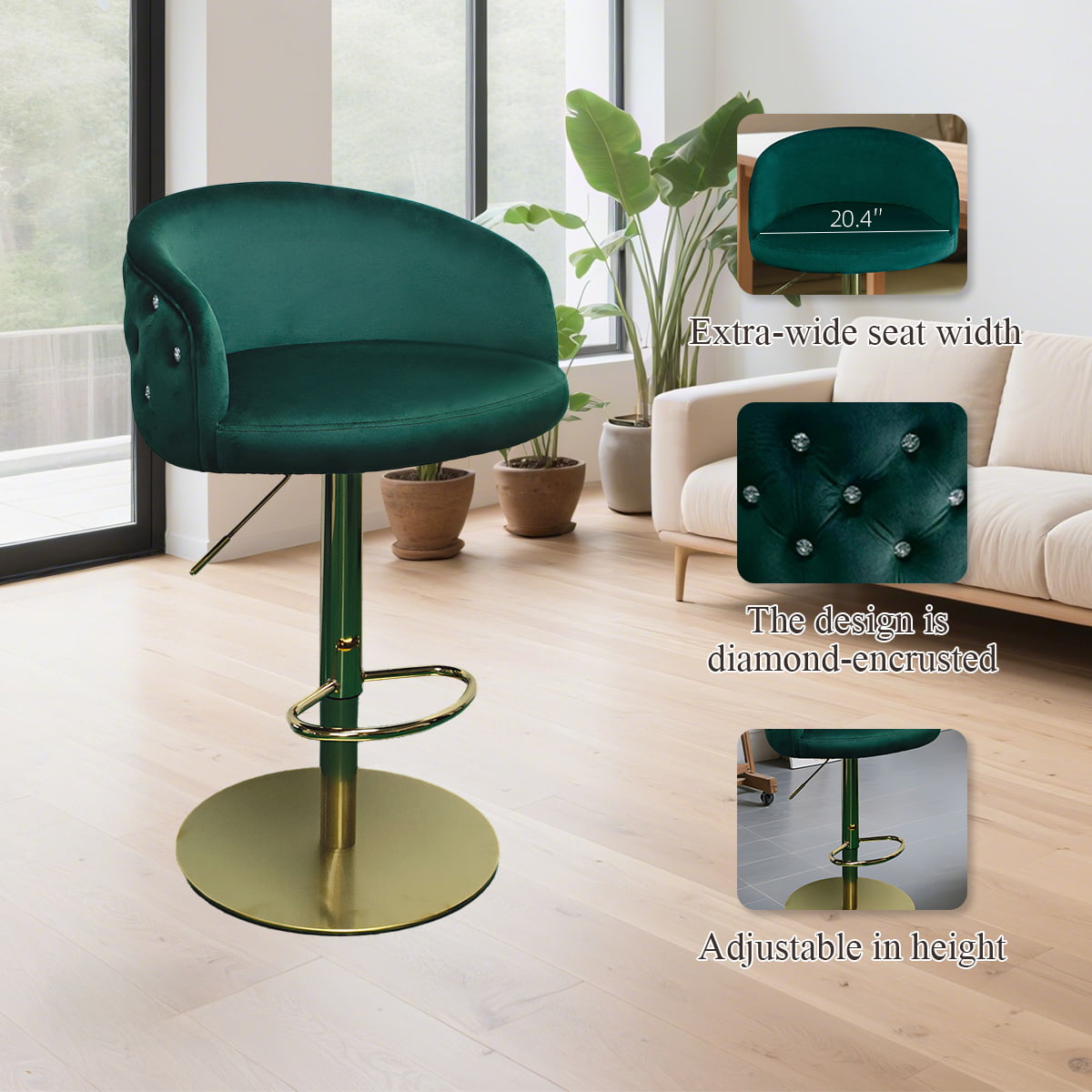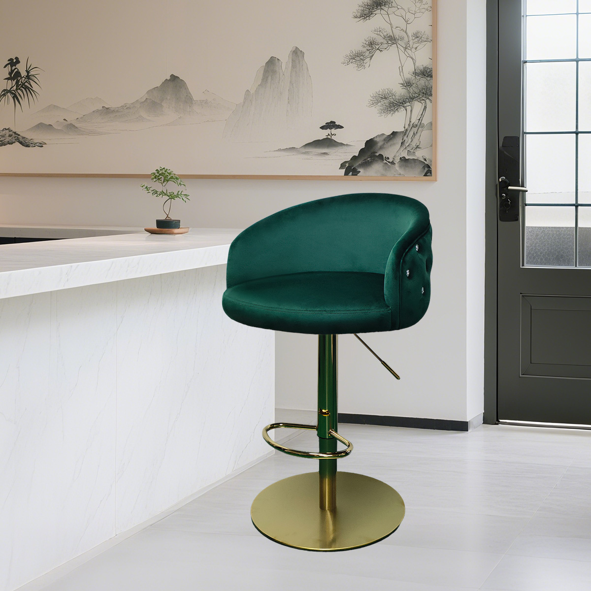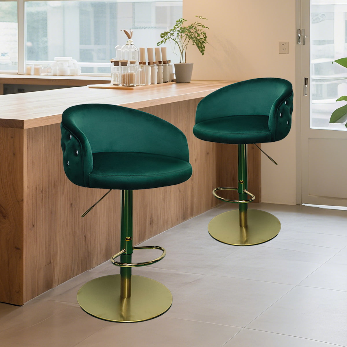Modern Green Velvet Adjustable Bar Stool na may Tufted Backrest at Gold Base