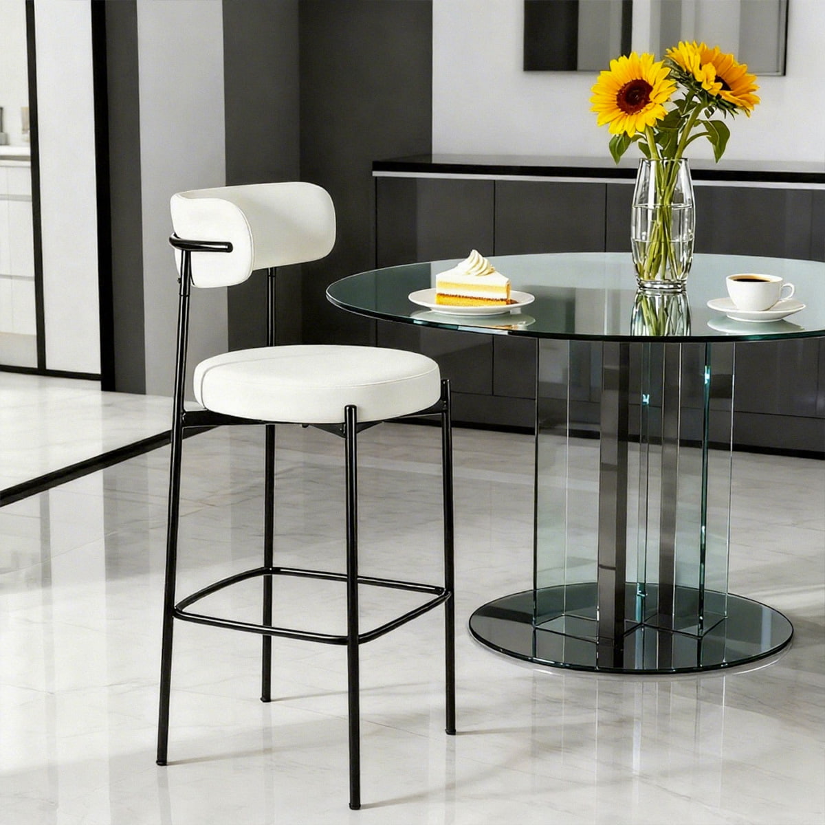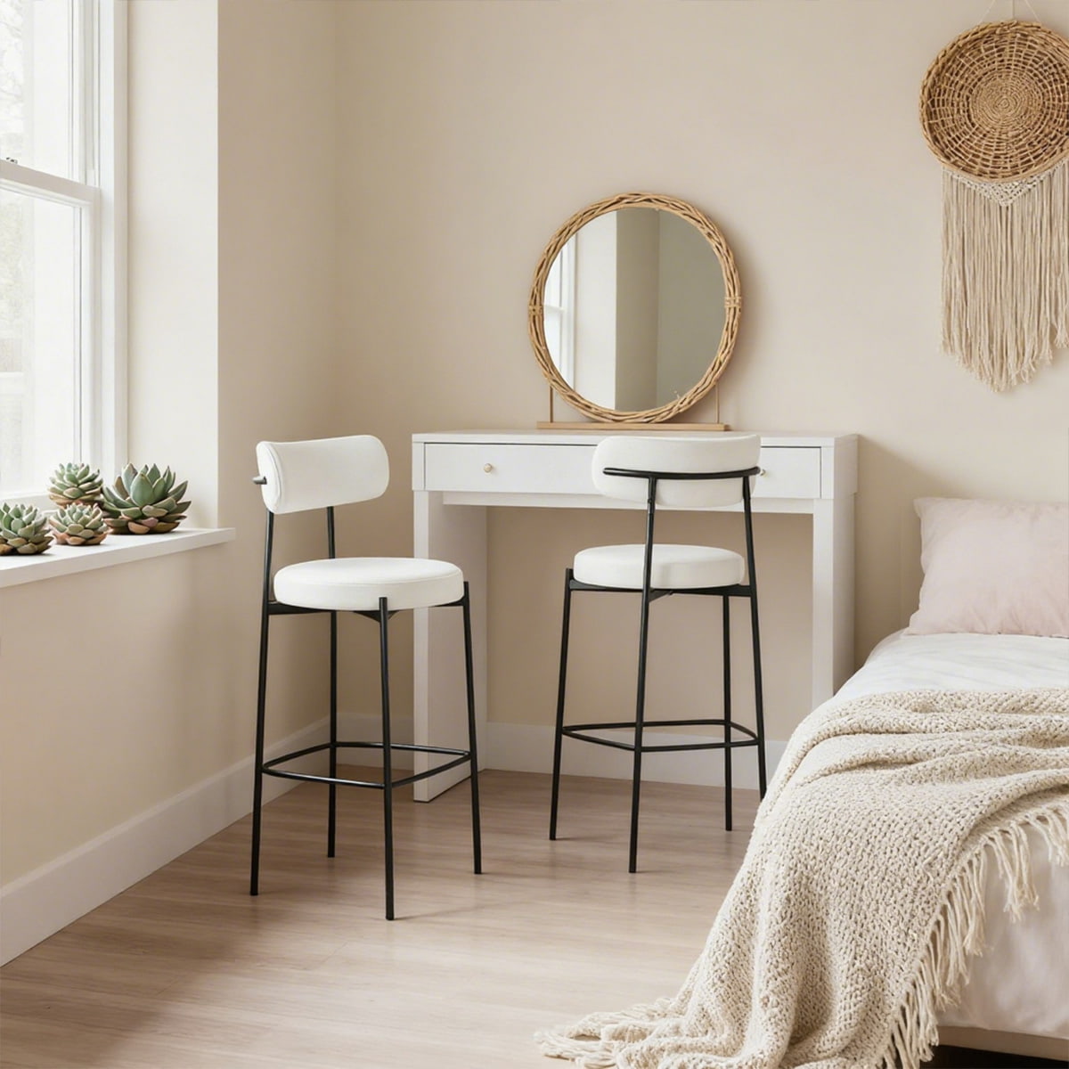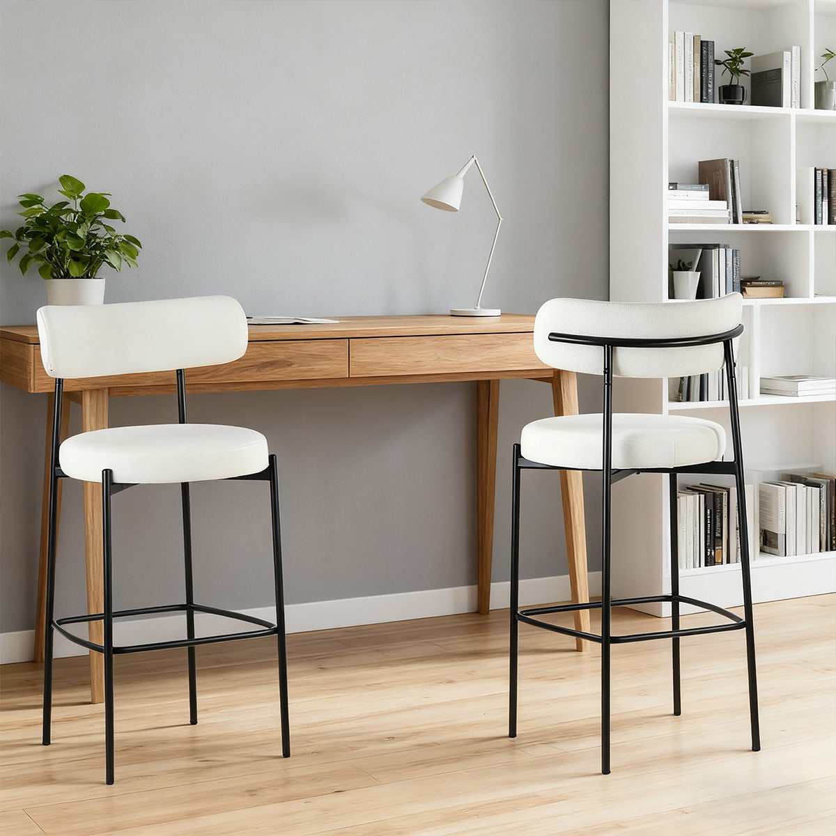 Ang aming mga puting bouclé counter stools ay inhinyero para sa ginhawa at istilo, na nagtatampok ng matibay na itim na metal na mga frame, mga upuan ng foam na may mataas na density, at mga ergonomikong backrests-mainam para sa mga counter ng kusina, bar, restawran, at mga hotel.