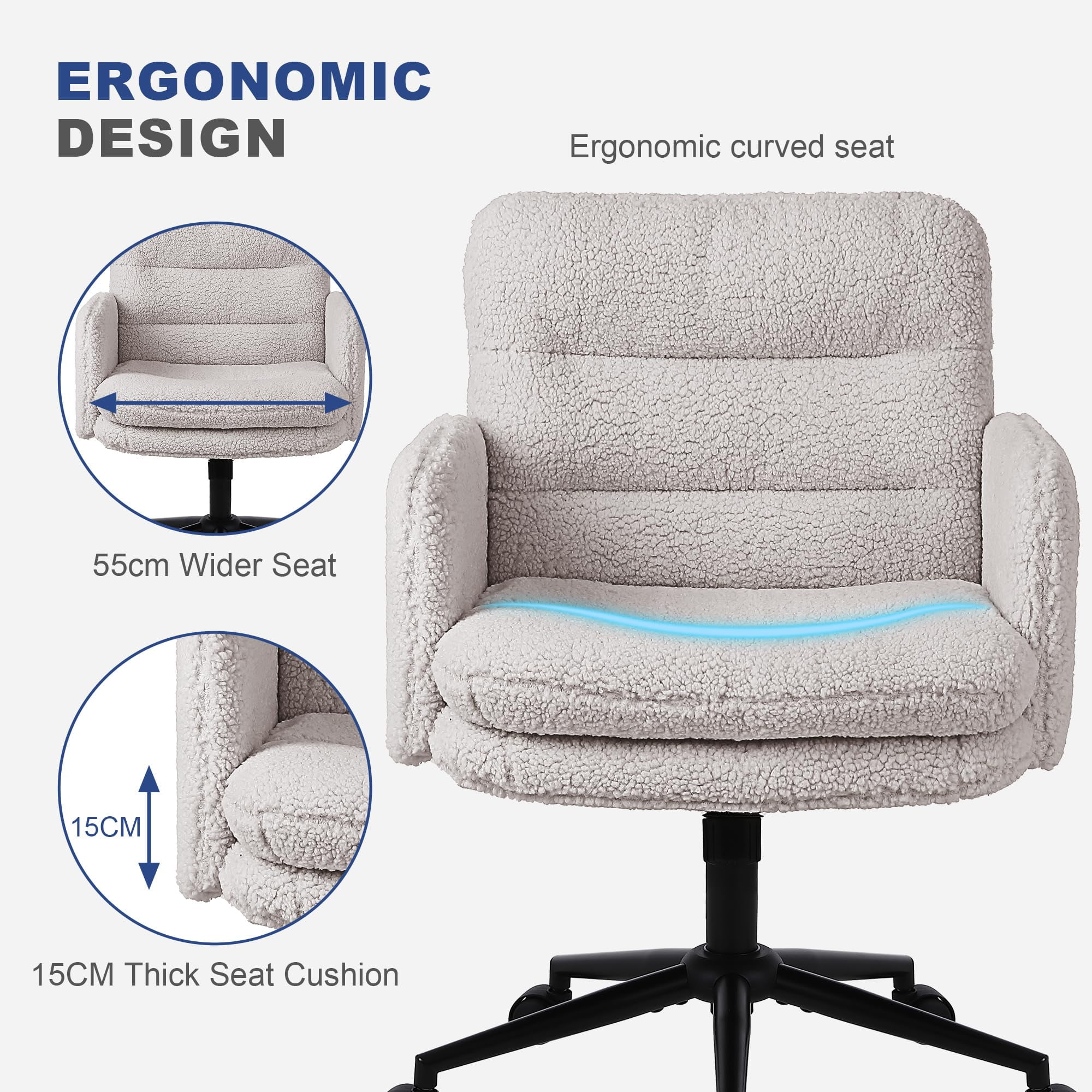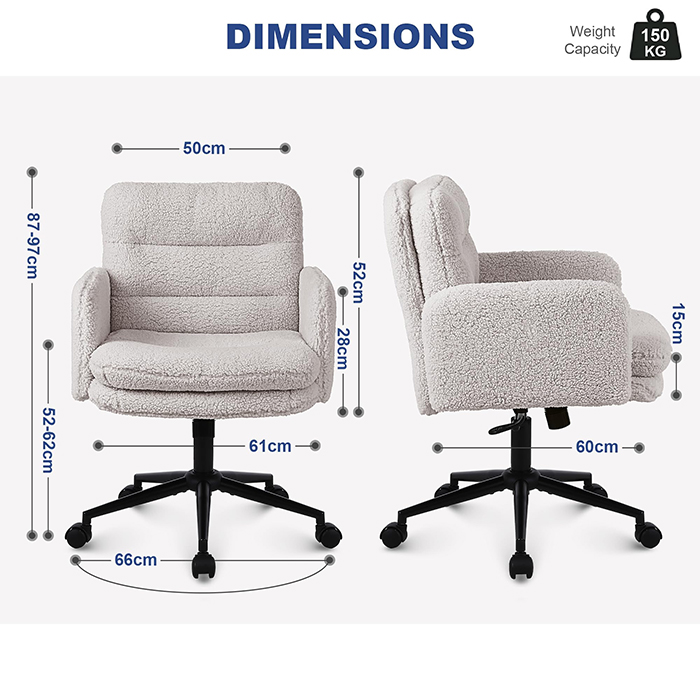 Ang faux cashmere office chair na ito ay idinisenyo para sa mga mamimili na naghahanap ng balanse sa pagitan ng ginhawa, aesthetics, at maaasahang kalidad ng pagmamanupaktura. Upholstered sa malambot, skin-friendly na faux cashmere na tela, ang upuan ay nagtatampok ng makapal na 15 cm na high-density na cushion na nagbibigay ng pangmatagalang suporta nang hindi bumabagsak, na ginagawa itong perpekto para sa matagal na trabaho, pag-aaral, o paggamit ng vanity. Ang ergonomic na istraktura ng upuan, na sinamahan ng makinis na 360-degree na swivel na paggalaw, pagsasaayos ng taas, at banayad na pag-andar ng tumba, ay nagpapahusay sa pang-araw-araw na kaginhawaan sa pag-upo habang pinapanatili ang malinis, modernong hitsura na angkop para sa mga opisina sa bahay, silid-tulugan, at mga interior na nakatuon sa pamumuhay.