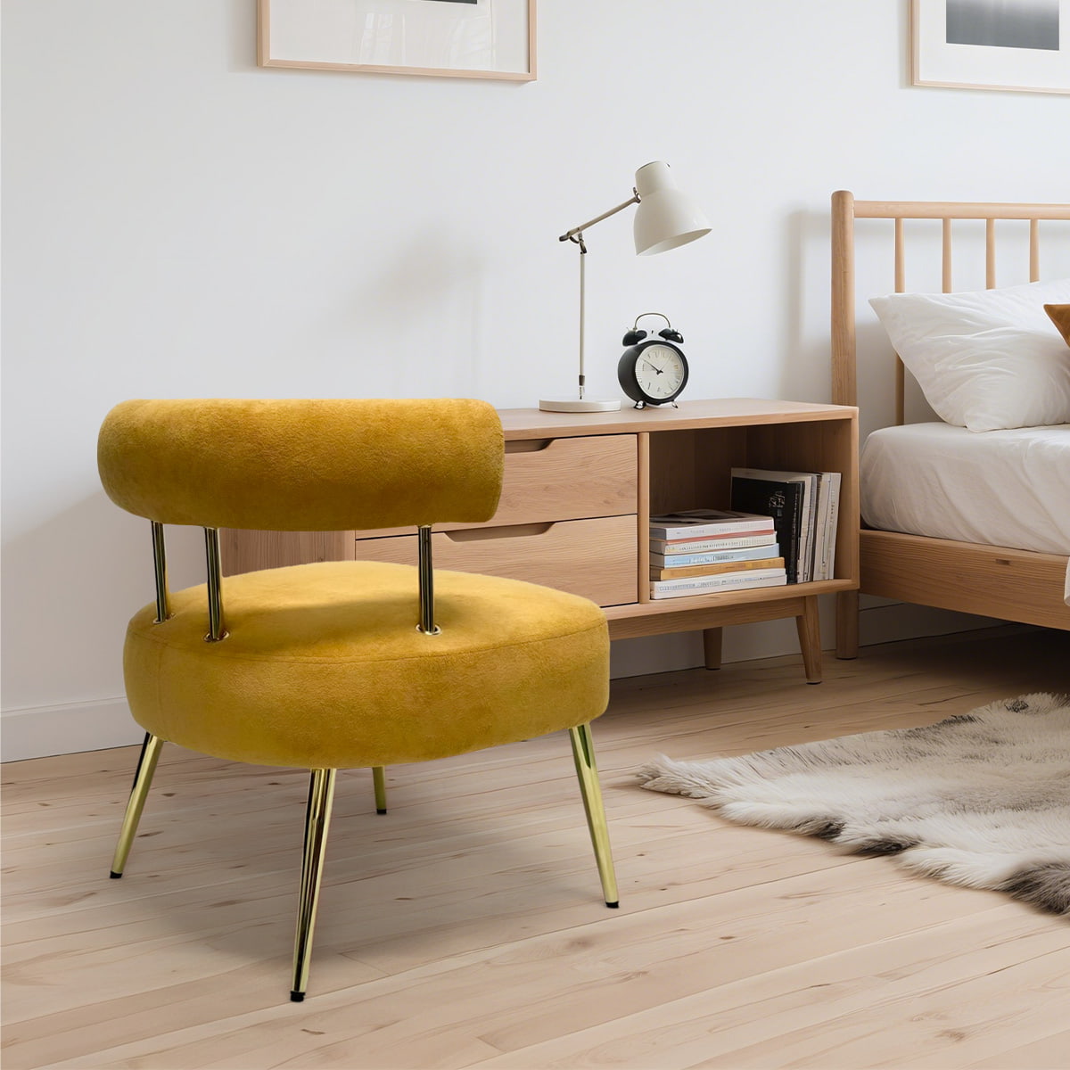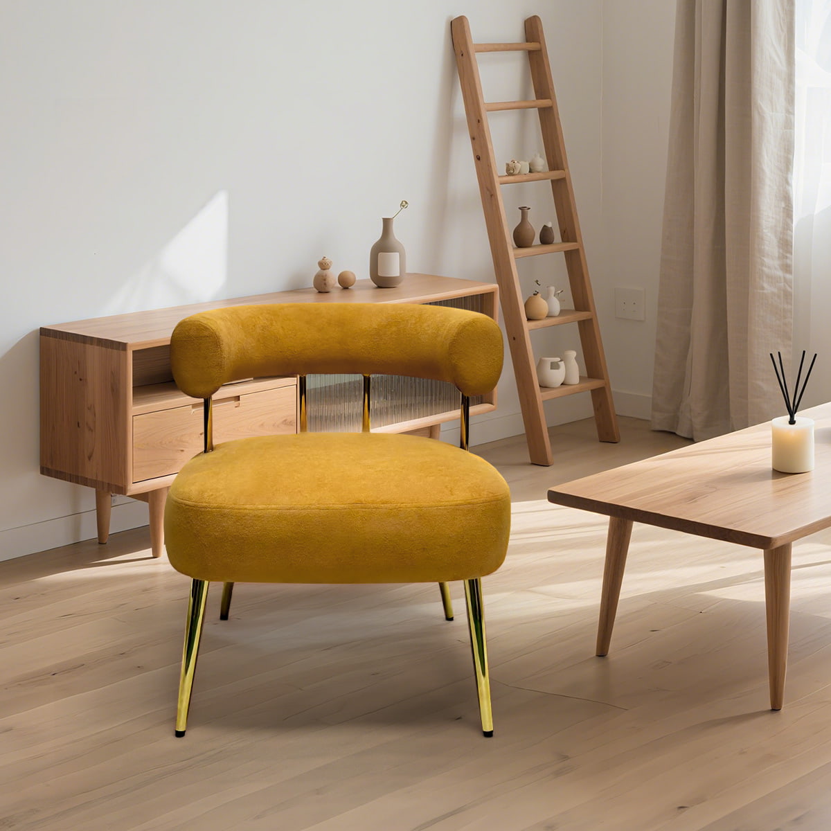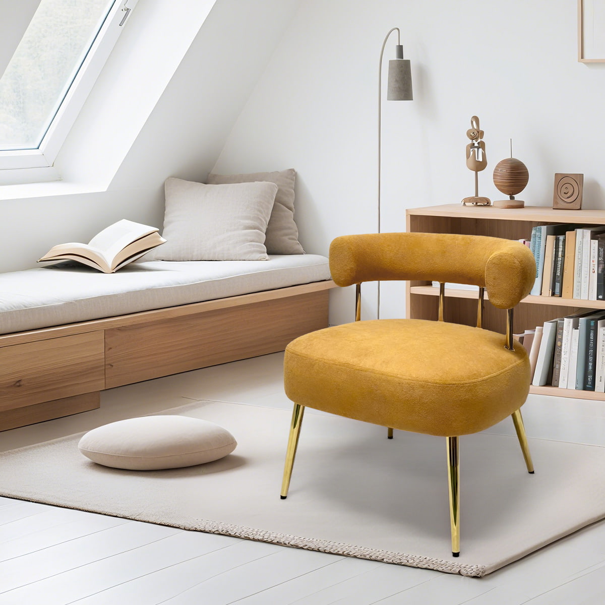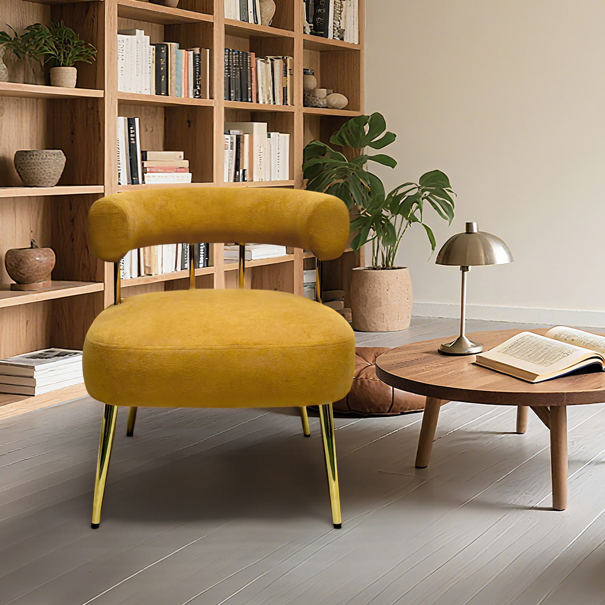 Ang disenyo ng bariles-back na may suportadong padding ay nagsisiguro ng pinakamainam na suporta sa lumbar, habang ang makapal na unan ng upuan ay nagpapanatili kang komportable kahit na sa mahabang oras ng paggamit. Ang pagpahinga sa mga electroplated na binti ng ginto na may mga anti-slip foot pad, ang accent chair na ito ay pinagsasama ang katatagan na may disenyo ng upscale, pagdaragdag ng isang ugnay ng kagandahan sa anumang puwang.
