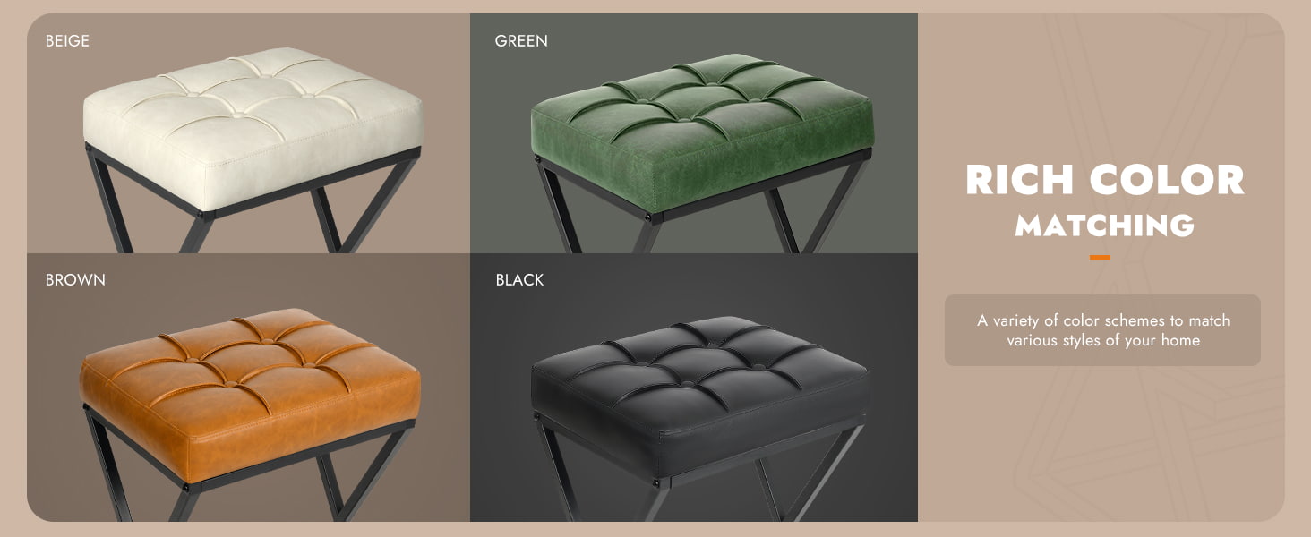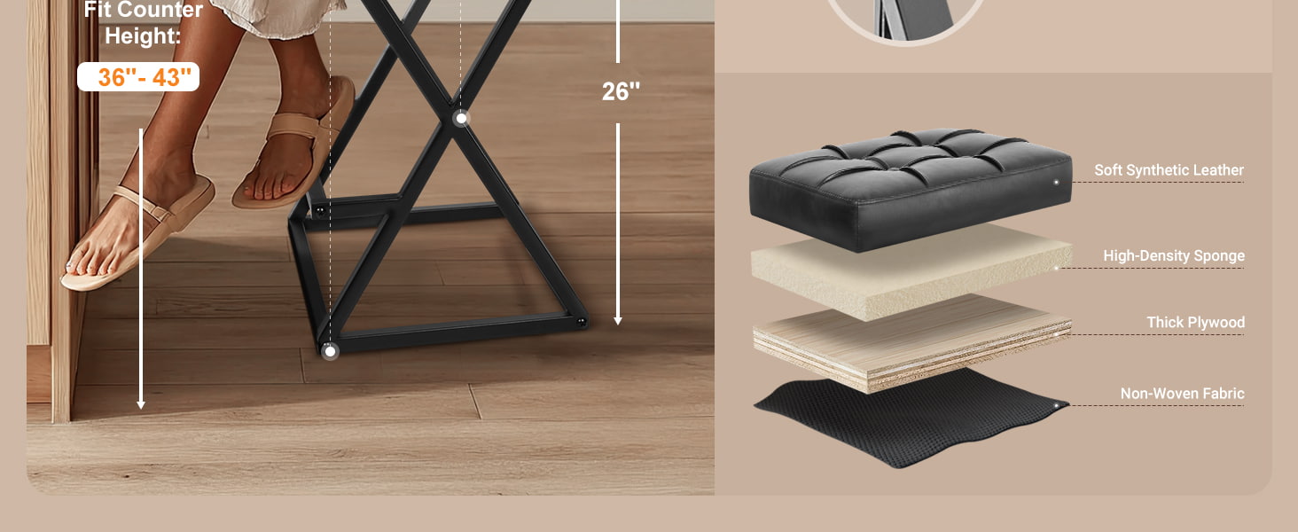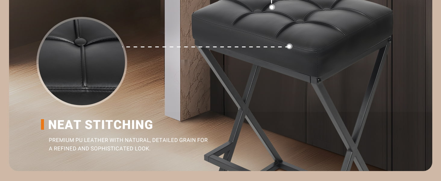 matuto paItong counter height backless bar stool ay idinisenyo para sa mga modernong kusina at mga compact na living space kung saan mahalaga ang functionality at malinis na aesthetics. Upholstered sa makinis na faux leather at suportado ng isang reinforced X-frame metal base, ang stool ay naghahatid ng maaasahang katatagan at pang-araw-araw na kaginhawahan. Ang 26-pulgadang taas ng upuan ay perpektong pares sa karaniwang mga isla sa kusina at mga counter, habang ang backless na disenyo ay nagbibigay-daan sa stool na mailagay nang maayos sa ilalim kapag hindi ginagamit. Na may malakas na 450 lbs na kapasidad ng timbang at madaling linisin na mga materyales, ang stool na ito ay isang praktikal na solusyon sa pag-upo para sa parehong residential at light commercial application.