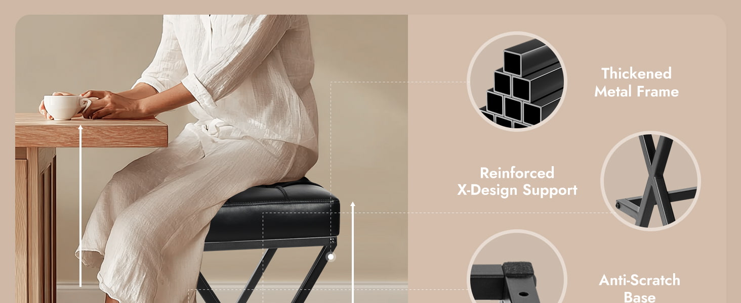 Dinisenyo para sa parehong residential at light commercial environment, itong counter height backless bar stool ay nagtatampok ng reinforced X-frame metal structure, high-density foam padded faux leather seat, at compact footprint na perpekto para sa mga kusina, apartment, cafe, at hospitality project. Ang 26-pulgadang taas ng upuan ay umaangkop sa mga karaniwang isla ng kusina at mga counter, habang ang backless na disenyo ay nagbibigay-daan sa stool na ganap na mag-slide sa ilalim, na mapakinabangan ang magagamit na espasyo.
