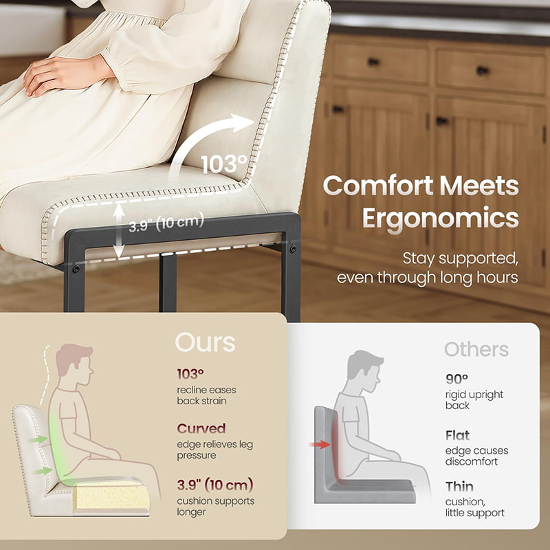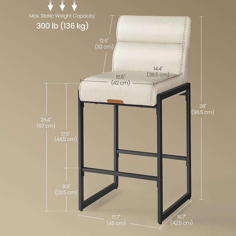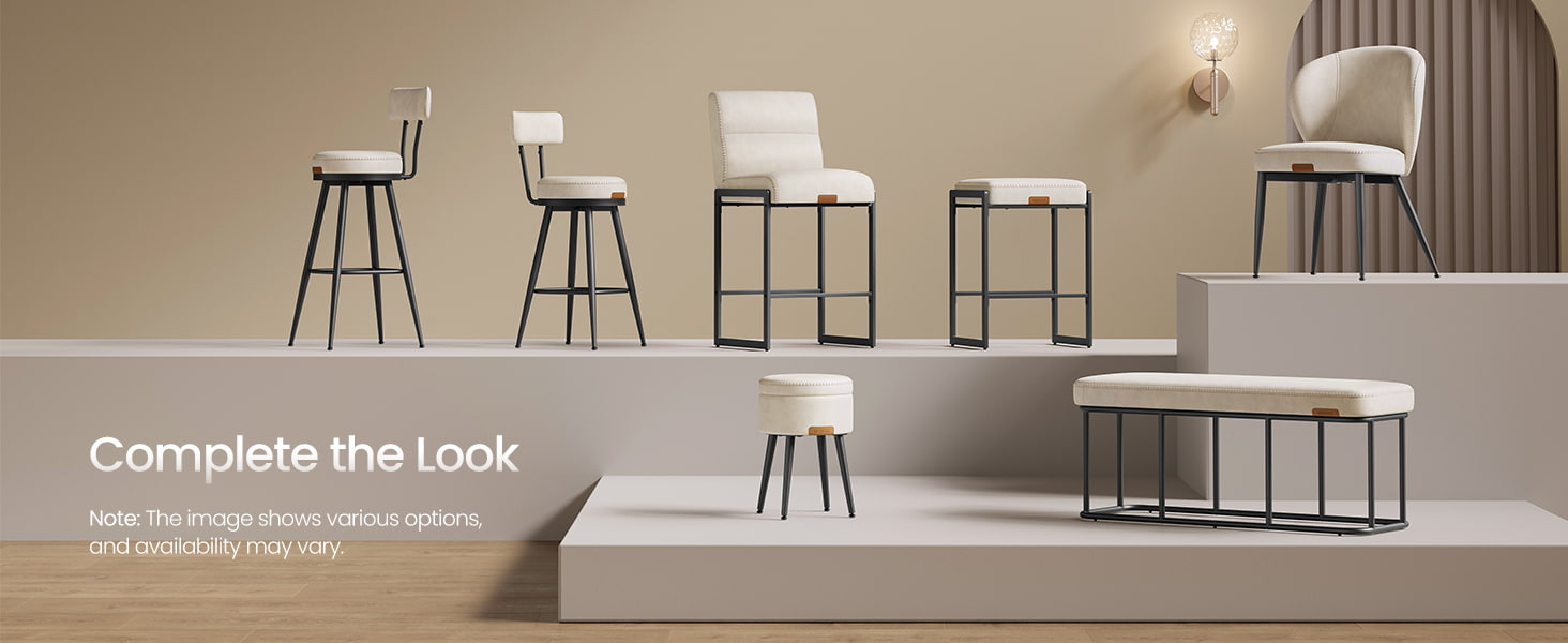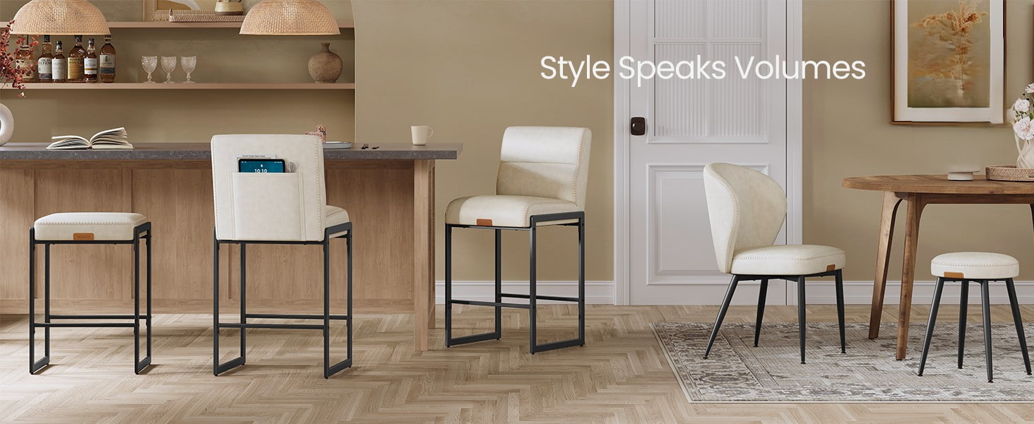 Mga modernong bar stool sa kalagitnaan ng siglo na idinisenyo para sa mga counter ng kusina at dining island, ang cream white counter-height na upuan na ito ay nagtatampok ng matibay na synthetic leather upholstery na may pinong tahi at malinis na arkitektural na metal frame. Ang ergonomic na 103-degree na naka-segment na backrest, 3.9-inch na makapal na cushioned seat, at curved front edge ay nagbibigay ng pangmatagalang kaginhawahan para sa pinahabang pag-upo, na ginagawang angkop ang mga ito para sa parehong residential kitchen at light commercial environment tulad ng mga cafe o showroom.