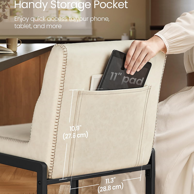 Ang makinis na synthetic leather surface ay nakadetalye sa banayad na tahi, na naghahatid ng isang crafted na hitsura habang nananatiling madaling mapanatili-ideal para sa mga abalang sambahayan at mga light commercial setting. Ang isang malumanay na hubog na gilid ng upuan ay nakakatulong na bawasan ang presyon ng binti, habang ang pinagsamang likod na bulsa ay nagdaragdag ng maginhawang storage para sa mga telepono, tablet, o maliliit na mahahalagang bagay. Sinusuportahan ng isang matibay na metal frame na may mga nakatagong adjustable na paa, tinitiyak ng bar stool na ito ang katatagan sa iba't ibang mga ibabaw ng sahig at madaling umaangkop sa mga modernong kusina, dining space, o kaswal na nakakaaliw na lugar.