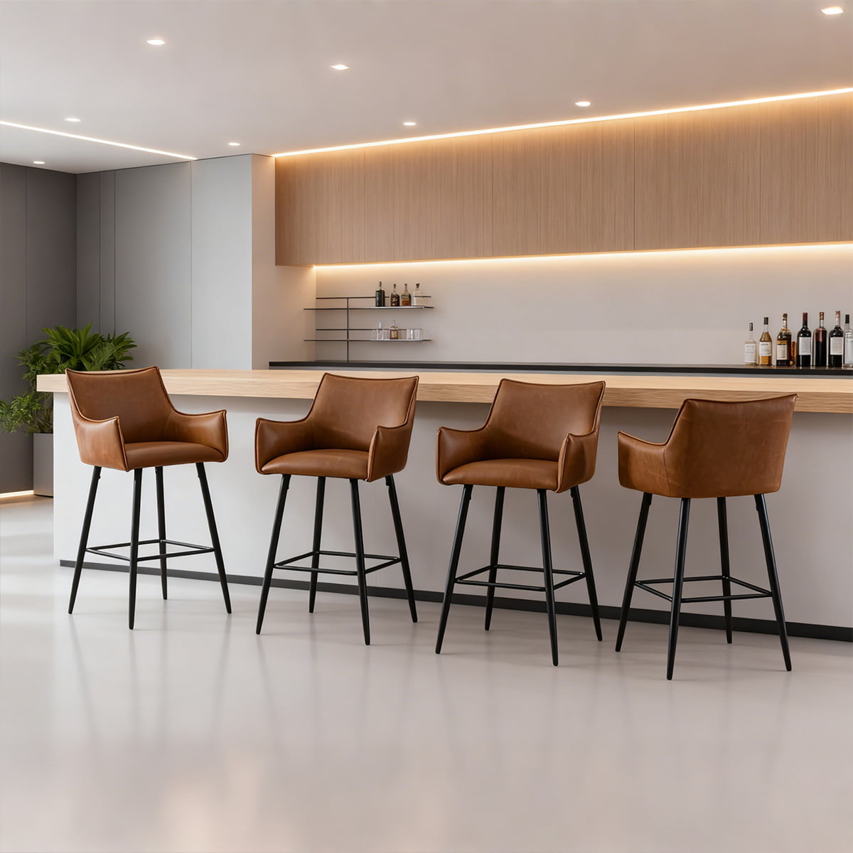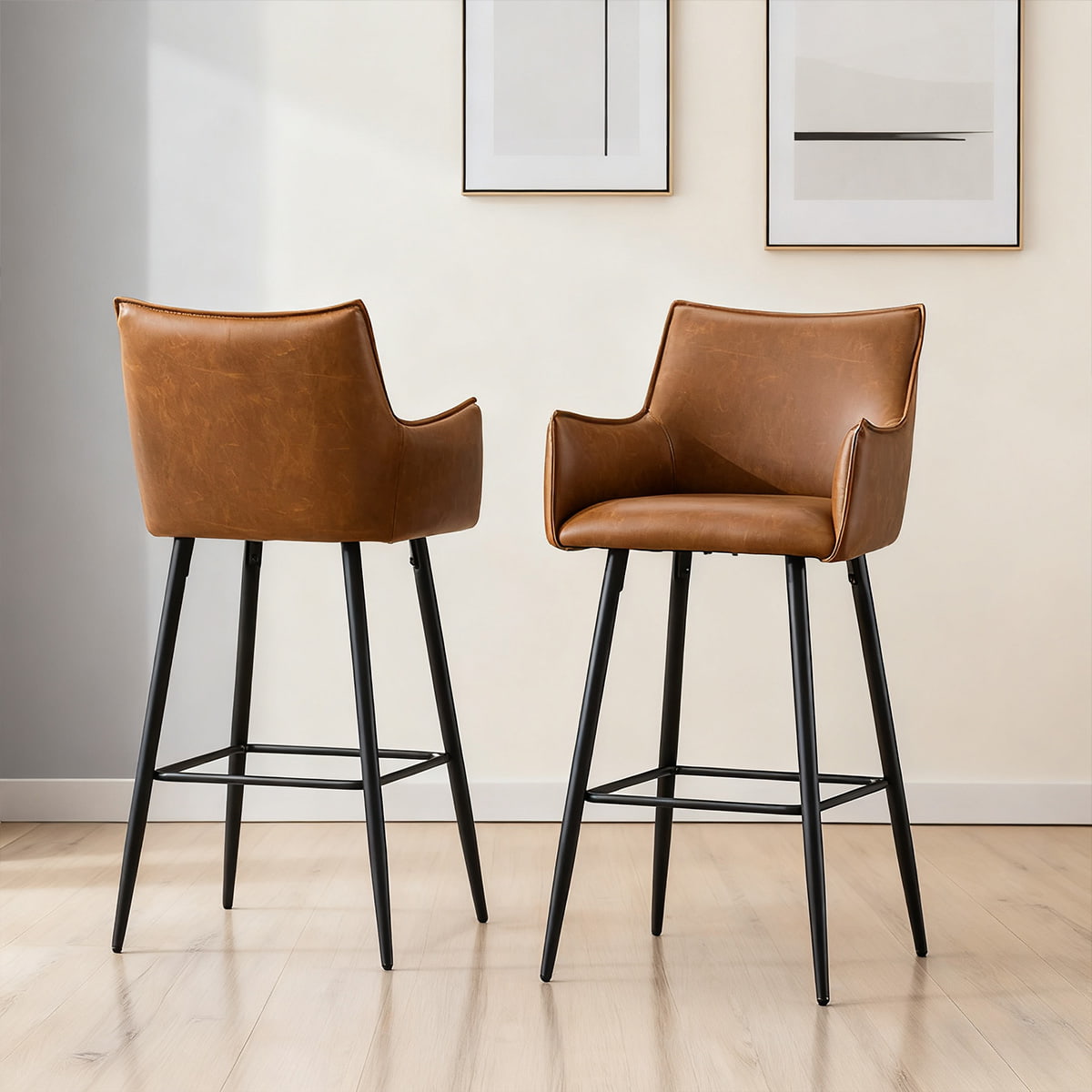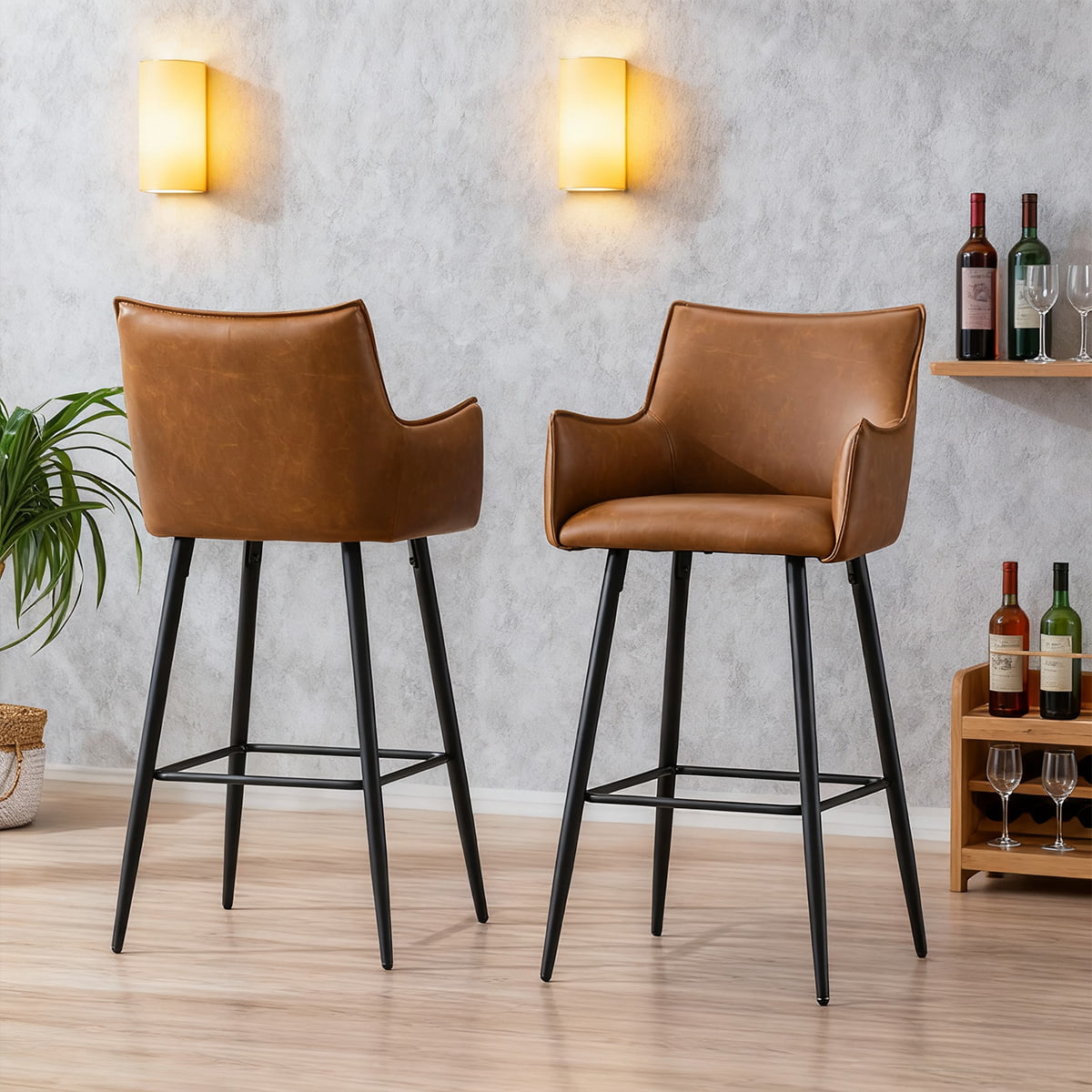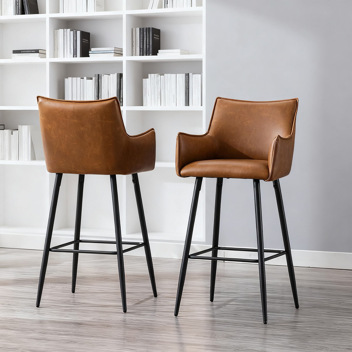 Modernong brown pu leather bar stool na may armrests & backrest - counter taas upholstered bar chair na may itim na metal na binti para sa kusina isla, bistro, o home bar